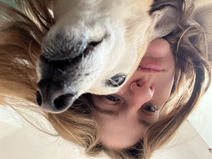 A close-up, slightly upward-angled image depicts a female individual and a tan-colored dog in an indoor setting