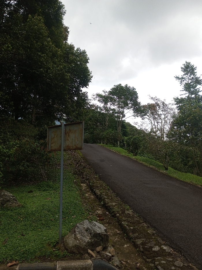 The scene depicts a narrow, dark asphalt road ascending through a verdant, tree-covered landscape in Kanand, India. The sky overhead is heavily overcast with grey and white clouds. On the left side of the road, a steep, densely vegetated slope rises, covered in numerous tall, dark green trees and thick undergrowth. A rectangular metal sign, heavily rusted and illegible, stands on a grey pole in the foreground, positioned on the grassy verge to the left of the road. The sign faces away from the viewer. Two large, grey-white boulders rest on the green grass near the bottom left of the frame, alongside a concrete curb that features a section of black piping. The asphalt road, dark grey and appearing recently paved or well-maintained, curves gently upwards and to the right, disappearing behind the trees in the mid-ground. Along the right edge of the road, a concrete or stone drainage ditch, showing signs of weathering and some moss, runs parallel to the road. Beyond this ditch, the terrain continues to ascend, populated by various trees, some appearing as part of a cultivated plantation. No people are visible. A small, dark bird is silhouetted against the clouds high in the sky, towards the upper center-right of the image.