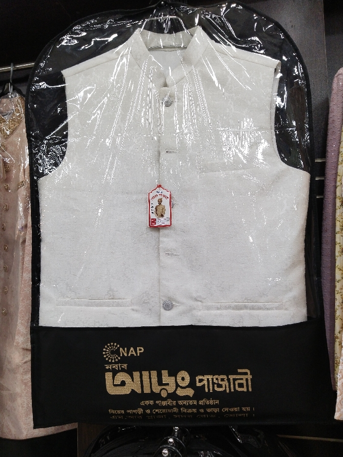 white waistcoat displayed in a shop in Bhola, Bangladesh (latitude: 22.685, longitude: 90.644). The waistcoat is made of a white, textured fabric and is folded in half, with a black plastic hanger. It is on display inside a clear plastic garment bag. The garment bag is hung on a black rack. The waistcoat has a button closure and two pockets. A small, red rectangular tag with a picture of a man is on the waistcoat. Below the waistcoat is a black fabric tag with the words "NAP" and "আড়ুতো পাড়াটী" in gold lettering. There is a smaller tag below the words, containing more text.