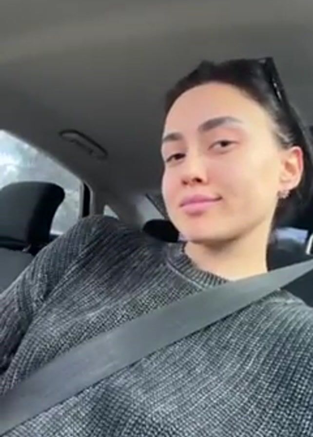 A young woman is sitting in the passenger seat of a car, wearing a gray sweater and a seatbelt. She has dark hair pulled back and is looking directly at the camera. She smiles and briefly holds up her fingers in a peace sign. The car interior is visible, including the black seats and the dashboard. There's music playing in the background. The scene is well-lit, and the video appears to be shot with a mobile phone. Through the car window, one can see trees.