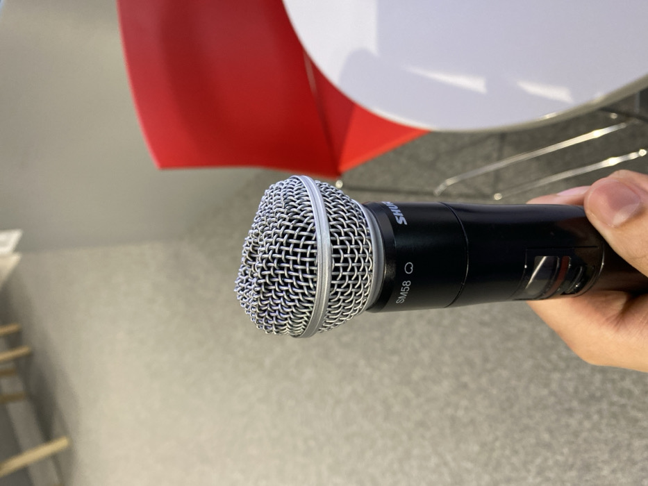 A light-skinned hand is holding a black Shure SM58 wireless microphone by its lower body