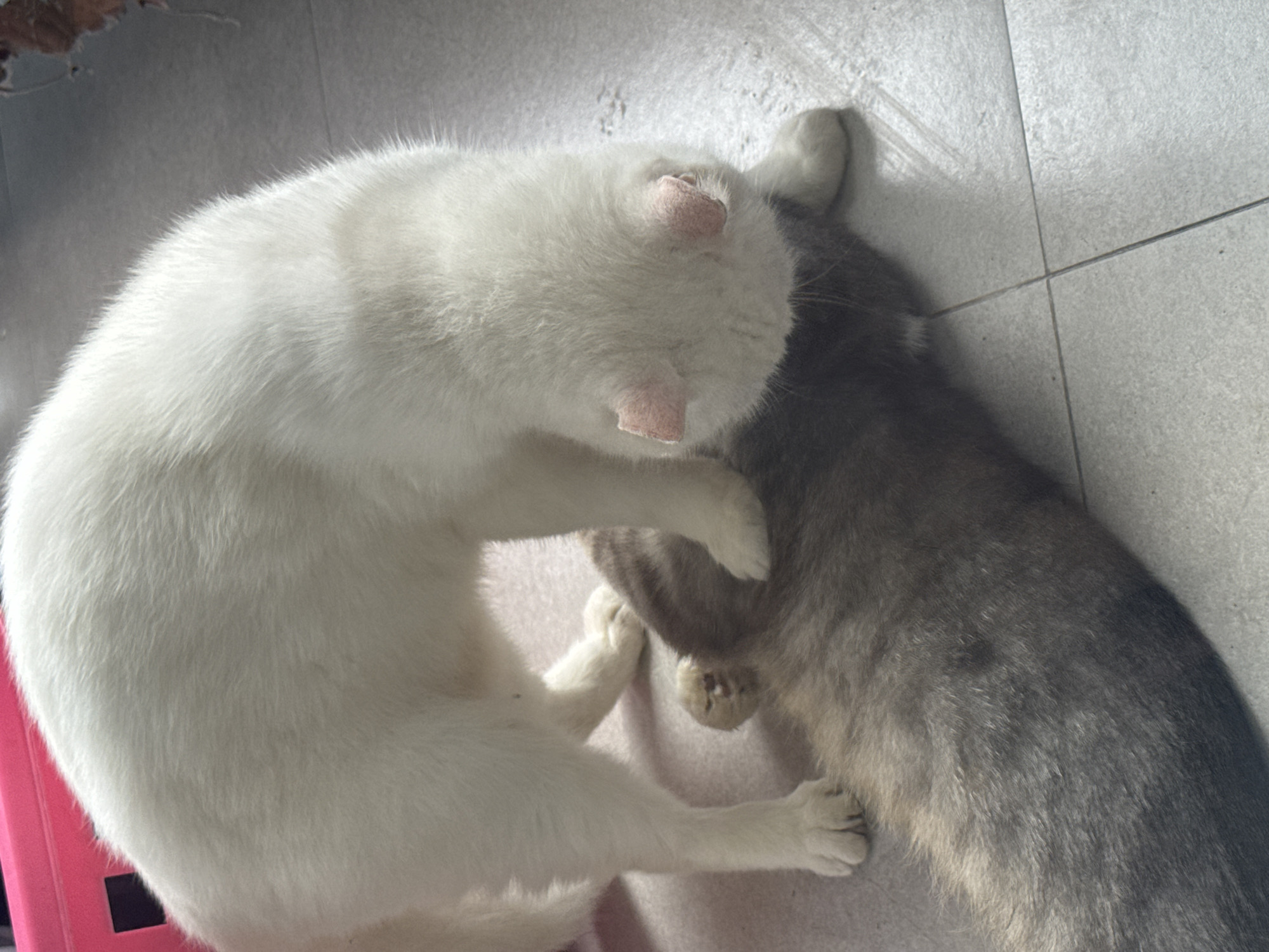 An indoor scene in Bekasi, Indonesia, depicts two domestic cats on a light grey tiled floor with dark grout lines. A white cat, facing towards the right and with its head lowered, stands over a larger, recumbent grey-brown mottled cat. The white cat's front paws are positioned on the back of the grey-brown cat. Its inner ears are visible and appear pink. The grey-brown cat is lying partially on its side or back, with one front paw bent and visible. A portion of a bright pink plastic object, possibly a crate, is visible in the upper left background.