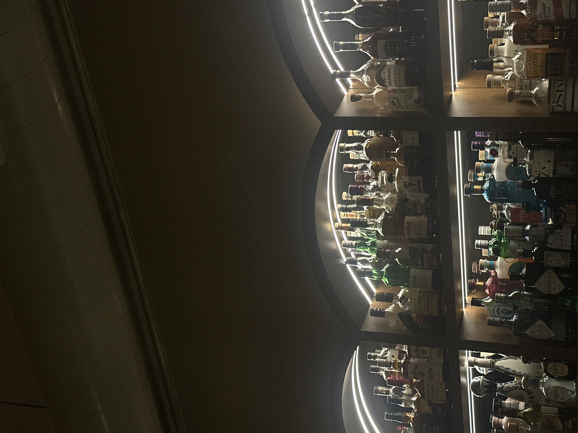 The image displays a bar shelf stocked with a variety of liquor bottles. Brands such as "Havana Club," "Hendrick's Gin," "Maker's Mark," and "ARARAT" are visible, suggesting an establishment with a diverse selection of alcoholic beverages. The shelves are illuminated by strip lighting, highlighting the bottles and creating an inviting atmosphere. The bar appears to be located in Yerevan, Armenia due to the presence of ARARAT brandy, a locally produced spirit.