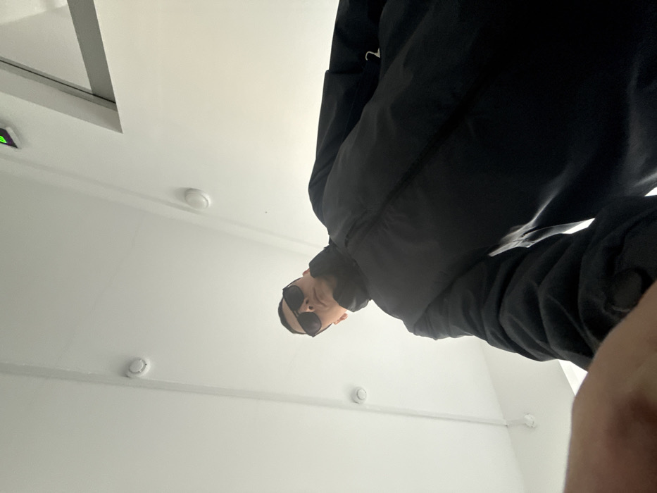 The image displays a male individual photographed from a low, upward-looking angle within an indoor setting, identified as being in Anapa, Russia. The subject is centered in the lower portion of the frame, visible from the upper torso, wearing dark rectangular sunglasses and a dark, high-collared puffer jacket. His left hand is partially visible in the bottom-left corner of the image, positioned close to the camera lens. The overhead environment features a light-colored ceiling with visible linear panel divisions and several circular, flush-mounted fixtures, consistent with either lighting or smoke detectors. In the upper-right section, a ceiling-wall junction is apparent, alongside a partially obscured green illuminated digital indicator, consistent with a display often found in an elevator or a public building corridor.