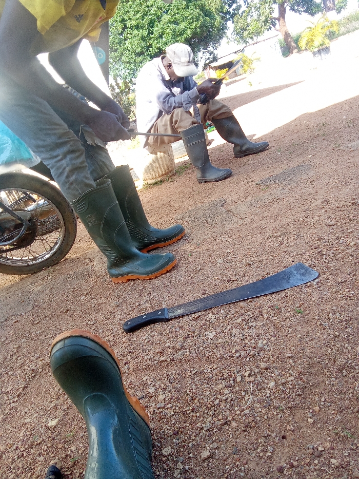 The image portrays an outdoor scene in Bar Jirgi Summa, Nigeria, under bright daylight. The ground consists of reddish-brown dirt and gravel with scattered small stones. In the immediate foreground, the top of a dark green rubber boot with an orange sole is visible. To the left, a person is partially obscured, wearing a yellow shirt, grey trousers, and dark green rubber boots with orange soles; they appear seated or leaning next to the front wheel of a motorcycle. In the midground, a man is seated on a white, weathered concrete block. He wears a light-colored long-sleeved shirt, brown trousers, a light-colored baseball cap, and dark green rubber boots. He is actively engaged with a dark rectangular object held in his hands, possibly a smartphone or tablet, with a thin dark rod resting across his lap. A long, dark-bladed machete with a black handle lies horizontally on the ground between the foreground boot and the seated man. The background features dense green foliage from trees and hints of distant light-colored structures.