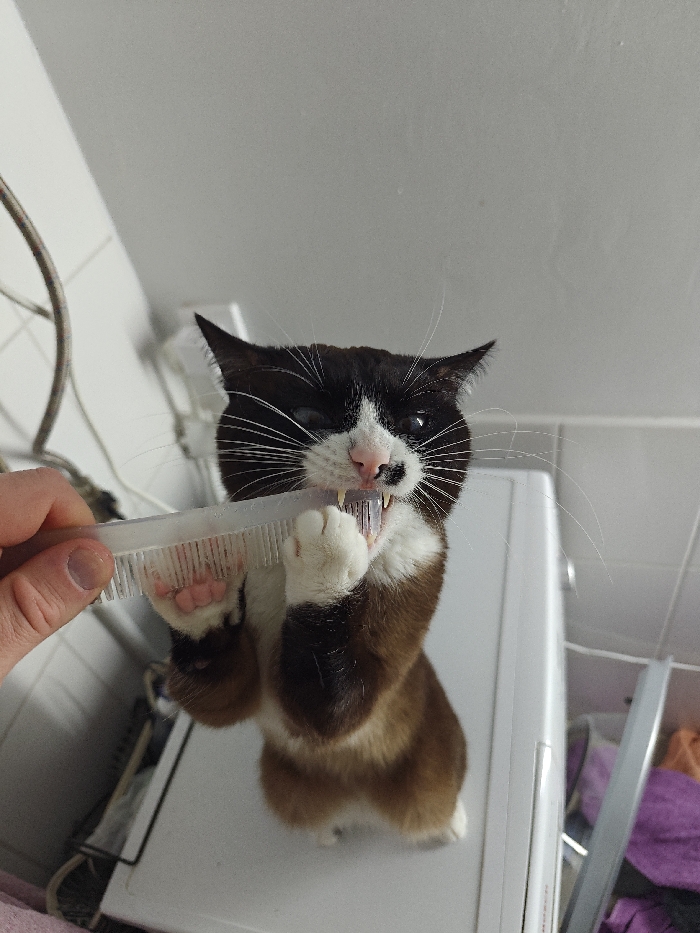 - "A bi-colored cat, predominantly dark brown/black on its body with a white chest, belly, and facial markings, stands on its hind legs, actively engaging with a translucent plastic comb" by FM-eMutn2, licensed under CC BY 4.0