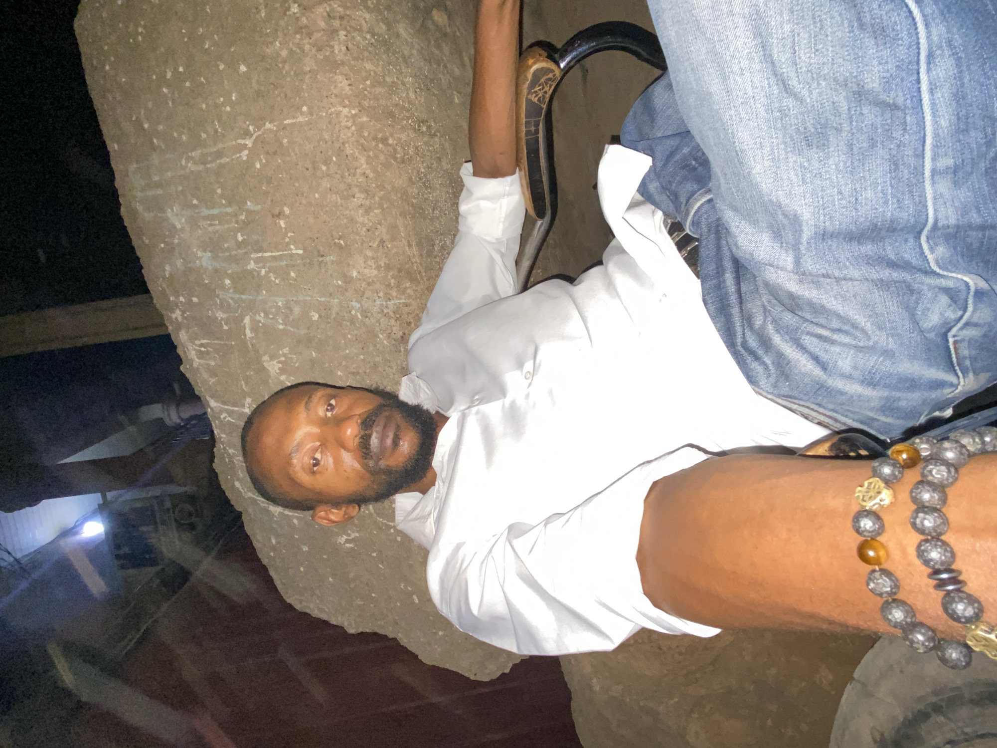 A man is seated on a bicycle in what appears to be an outdoor environment at night. He is wearing a white shirt and blue jeans. He is also wearing two beaded bracelets on his right wrist. The background consists of a rough, textured concrete surface. The location is possibly in Narayi, Nigeria, based on given information.