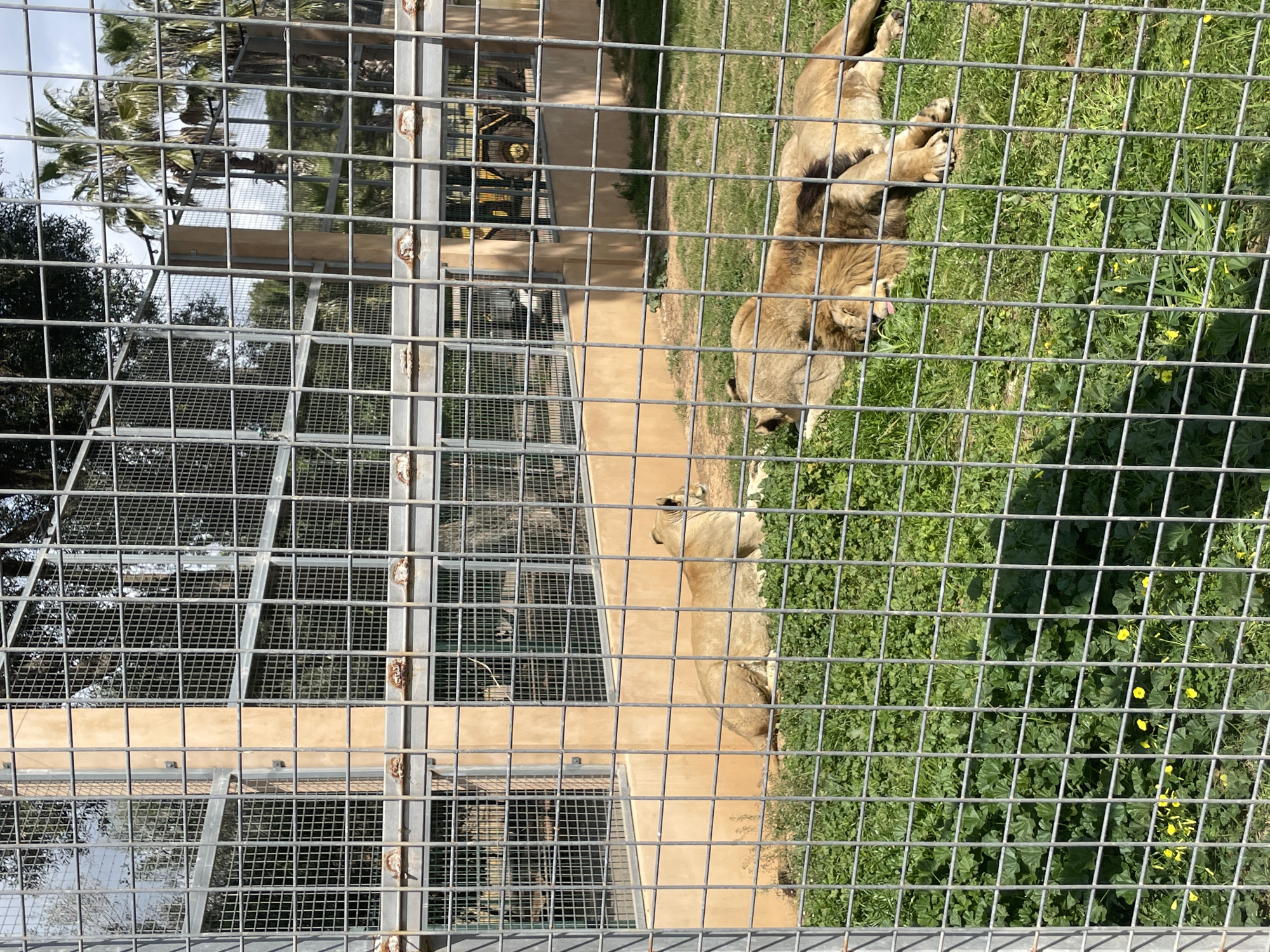 The image displays an animal enclosure, located in Sant Llorenç des Cardassar, Spain. A gray metal grid fence occupies the immediate foreground, acting as a barrier for the viewpoint. Inside the enclosure, three lions are present on a green grassy surface. One lioness is positioned on the left side, lying on the grass with her head slightly raised, facing right. To the right of the individual lioness, a male lion with a visible brown mane and another lioness are lying close together on the grass, both in a resting or sleeping posture. The male lion's tongue is partially extended. The ground is covered with green grass, broad-leafed plants, and several small yellow flowers. Behind the lions, a light tan-colored concrete wall forms part of the enclosure's perimeter. Further back, additional metal fencing and support structures are visible. The background features various green trees, including several tall palm trees. A yellow heavy machinery vehicle is partially discernible behind the structures on the right side of the frame. The scene is illuminated by natural daylight under a bright sky.