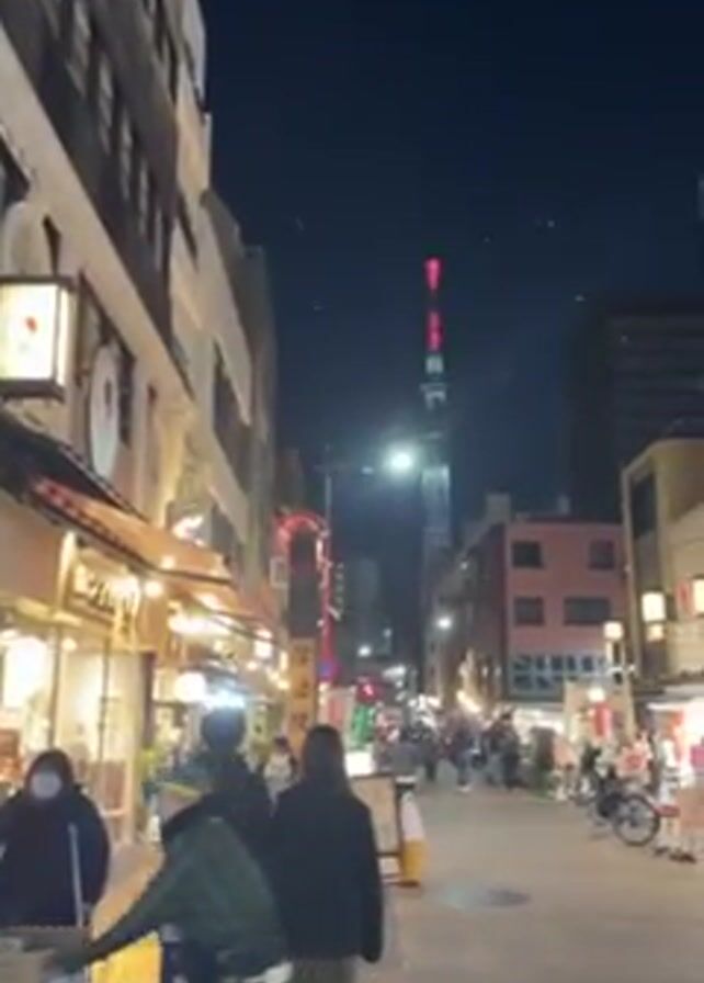 nighttime street scene in Japan. The Tokyo Skytree is visible in the distance, illuminated with rainbow colors. The street is lined with shops and restaurants, some of which are lit up. People are walking along the street. There is a man in green work clothes pulling a yellow cart along the street.