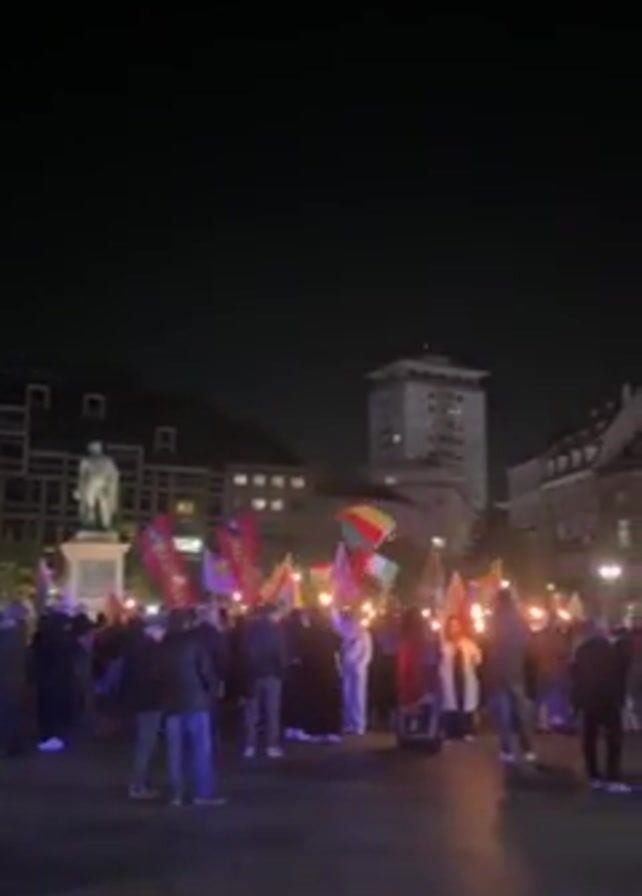 At night, a crowd gathers in a city square holding flags that are brightly colored with green, yellow, and red stripes. Some people carry handheld torches or lights. A statue stands tall at one side of the square, while taller buildings stand in the background. Many in the crowd wear dark clothing. Some people talk to each other.
