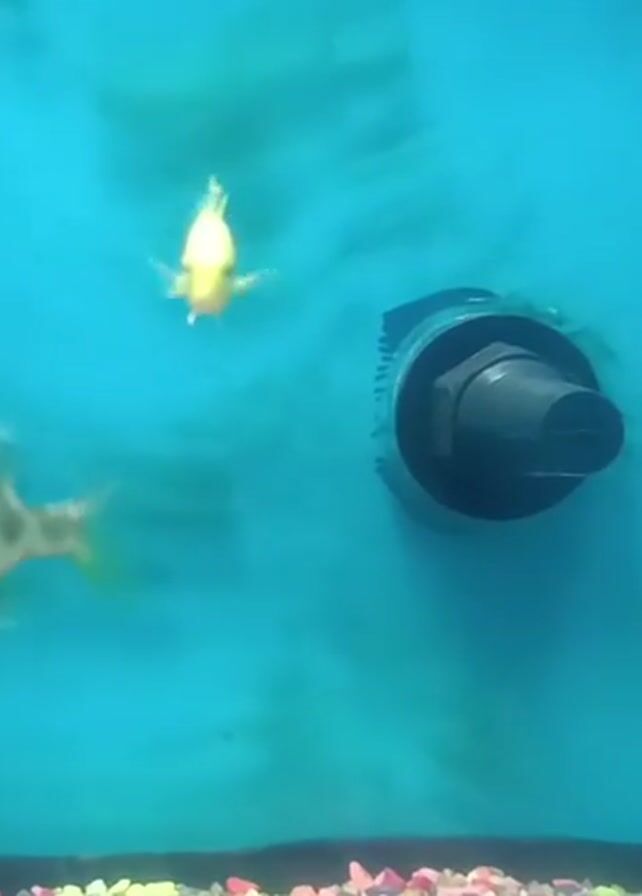 close-up of a fish tank with a blue background. There are four fish swimming in the tank: one is yellow, and the other three are patterned in gray and light yellow. At the bottom of the tank, there is a layer of colorful aquarium gravel. On the blue background, there is a large black outlet. In the upper right corner, a black filter is visible. The fish are moving around in the water.