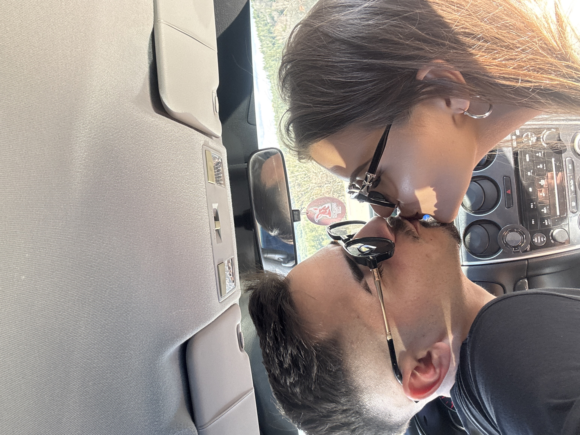A man and a woman are kissing inside a vehicle. The woman has long brown hair and is wearing glasses and hoop earrings. The man is wearing glasses and a black shirt. The interior of the vehicle is visible, including the dashboard, rearview mirror, and headliner. The location is not discernible from the image.