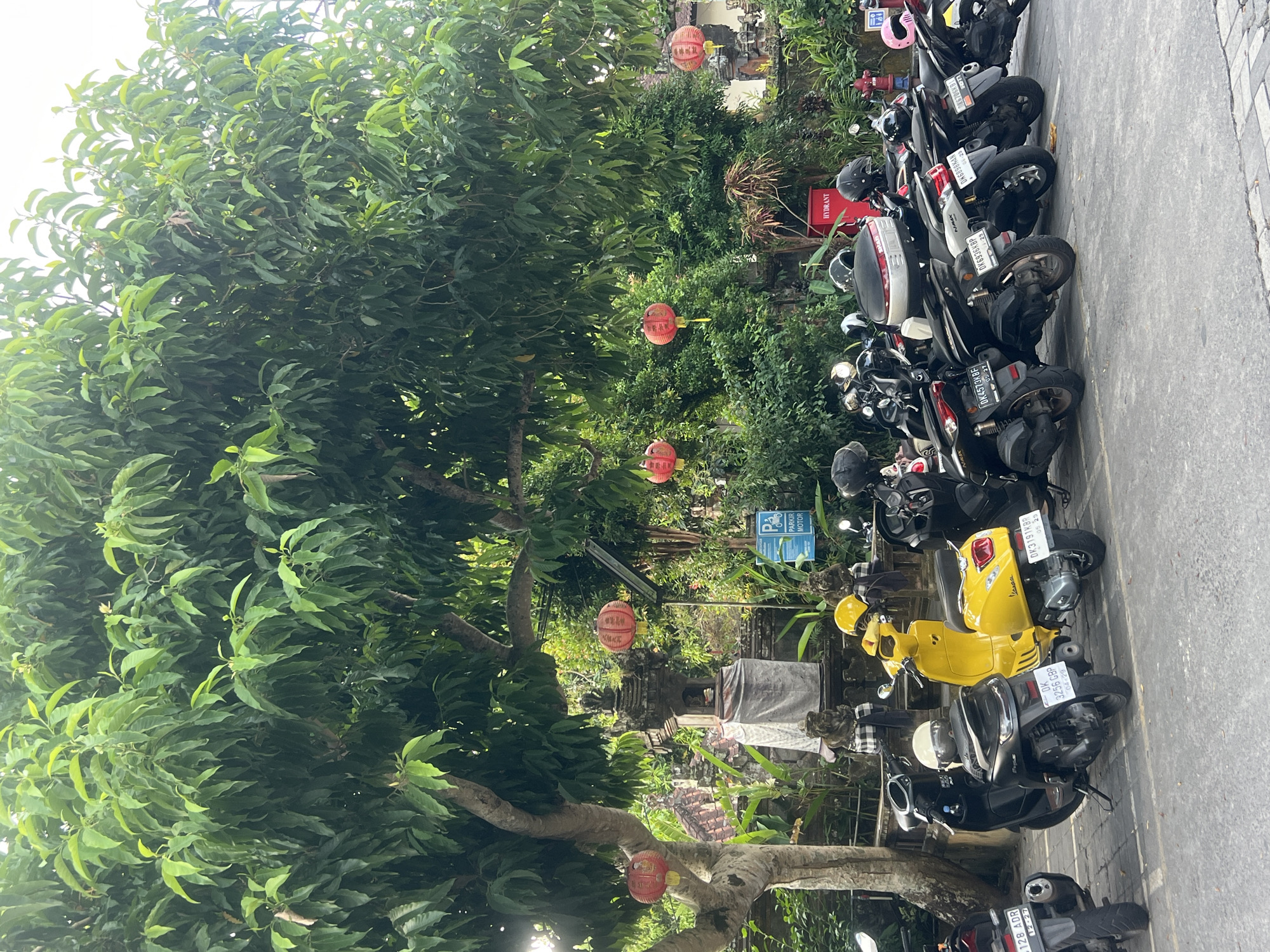 The image captures a street scene in Ubud District, Indonesia, showcasing a mix of natural and urban elements. A large, leafy tree dominates the left side of the frame. Red lanterns are hanging amidst the tree's branches and nearby vegetation. To the right, a row of parked motorbikes lines the street, varying in color. Signage including parking information is visible. In the background, architectural details of a building structure are also visible.