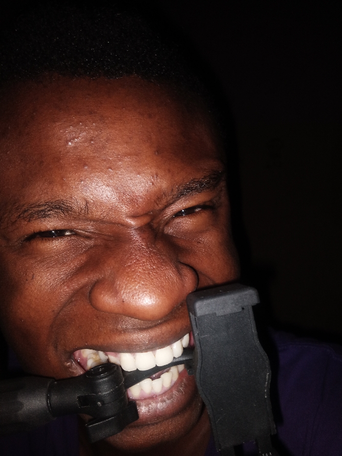 A close-up of a man's face fills the frame, contorted in a grimace. His dark skin glistens with moisture, and his eyes squint intensely. He forcefully clamps his teeth down on a black, indeterminate object that appears to be a phone mount. The background is dark, placing emphasis on the man's intense expression and the odd object in his mouth. His hair is short and tightly curled.