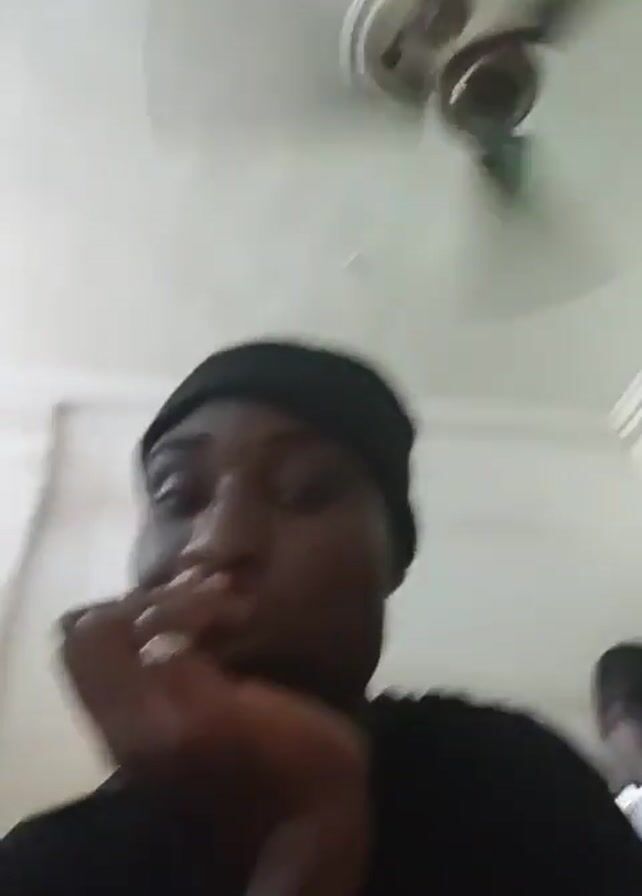 A low-angle shot depicts a young Black man wearing a black beanie and a silver ring, resting his chin on his hand. The background shows other young men, one in a red floral shirt and a baseball cap, in what appears to be an indoor space with large windows. A ceiling fan is visible above. The camera moves slightly, capturing more of the surrounding environment. There appears to be music playing in the background.