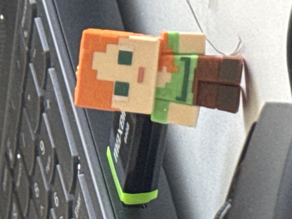 The image displays a close-up, shallow-depth-of-field shot of a desk or workstation setup. In the upper left background, an out-of-focus black laptop keyboard is visible, showing dark keys with light lettering. A black Maxell USB flash drive, distinguished by white "maxell" branding and a vibrant green band around its visible end, is partially inserted into a USB port on the left side of the laptop body. To the right of the USB drive, centered in the mid-ground, stands a small, blocky figurine representing the character "Alex" from the video game Minecraft. The figurine has an orange, block-style hairstyle, a beige face with two green square eyes and a small red mouth, a green pixelated shirt, and brown block-style legs. The figurine, USB drive, and the lower portion of the laptop rest on a light gray, slightly textured surface. A slender white fiber is present on the surface to the immediate right of the figurine. The precise location within Pernik, Bulgaria, is not discernible from the visual evidence.
