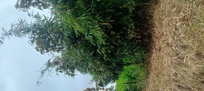 A field of dry grass and vegetation transitions into lush green foliage with trees and taller plant life. The sky is overcast, suggesting a cloudy day. The image is taken at an angle, giving a view upwards towards the trees and sky. A few saplings are visible amidst the greenery.