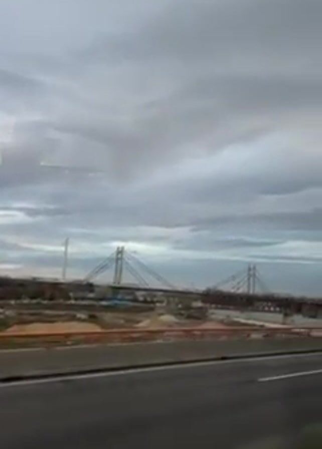 view from a moving vehicle on a highway. A white car speeds past in the opposite direction. In the distance, a bridge with tall suspension towers is visible. The sky is overcast with a thick layer of grey clouds.