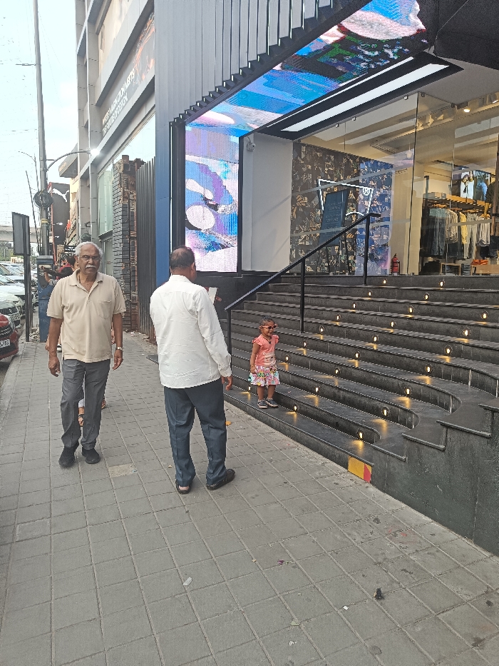 The scene takes place on a city sidewalk, likely in an urban area. The setting is an entryway to a storefront with a large digital display screen above, a black metal handrail, and a set of stairs leading up to a higher level. Two adult males are walking on the sidewalk, one facing the camera, the other facing away. A young girl in a pink dress and a white shirt stands on the edge of the stairs, looking down. The storefront windows display clothing. The area is paved with grey concrete tiles.