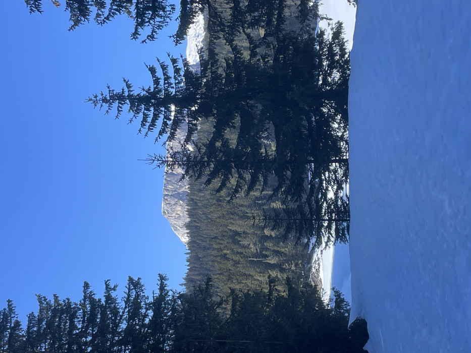 The image displays a winter landscape believed to be near Pitomine, Montenegro. In the foreground, a field of undisturbed snow occupies the lower third of the frame. The midground features several prominent, dark green coniferous trees, creating natural frames and partial obstructions. Between these trees, a body of water is visible, appearing largely frozen and covered with snow or ice. Behind the frozen water, a dense coniferous forest extends up a gradual slope. In the background, under a clear, bright blue sky, rugged mountains are present, with a distinct, rocky peak exhibiting patches of snow and illuminated by direct sunlight. No individuals, animals, or man-made structures are observed. The scene is characterized by bright, clear daylight conditions.
