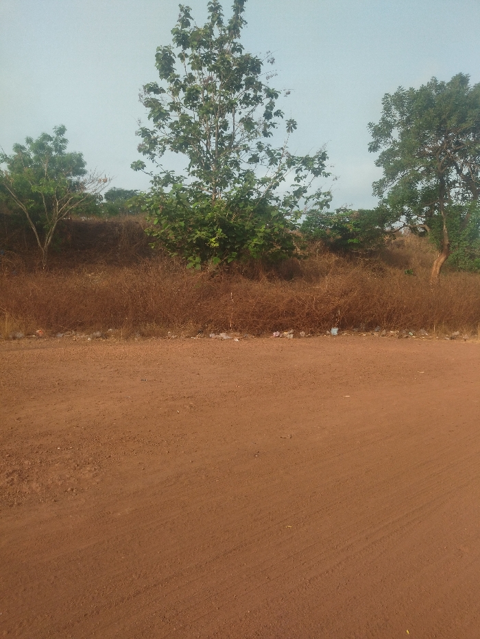 dirt road in the city of Tuoniako, Nigeria. The road is surrounded by dry, brown vegetation and a few scattered trees. The road is empty and there are no people present. The sky is clear and blue. The road is made of reddish-brown dirt and has tire tracks. There are some small pieces of white plastic scattered across the road. The location is in the state of Niger.