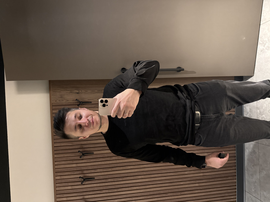 A man in dark clothes stands at an angle, taking a selfie. He wears a long-sleeved black shirt, dark jeans with a black belt, and a ring on his left hand. The background features a modern interior with a wood-paneled wall with coat hooks, a gray cabinet with a long handle, and tiled flooring. The phone in his hand is beige with multiple camera lenses.