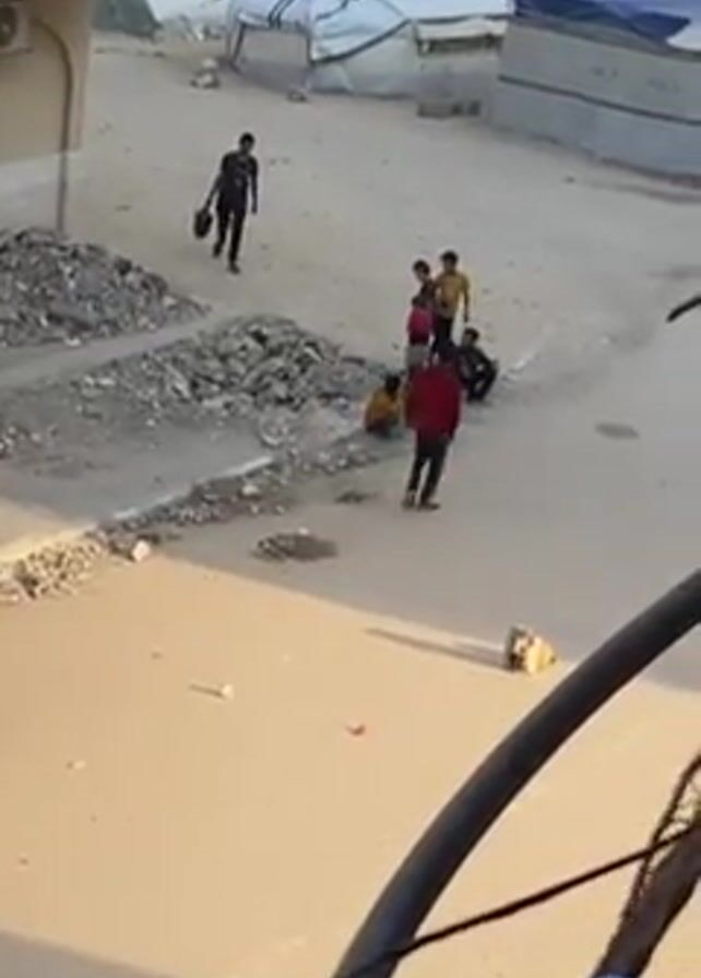 group of children near debris in a street with tents and damaged buildings in the background. One person is walking away from the group. Several children are looking at the ground, and some are crouching or sitting down near the debris. The scene appears to be filmed from an elevated position, likely from a building.