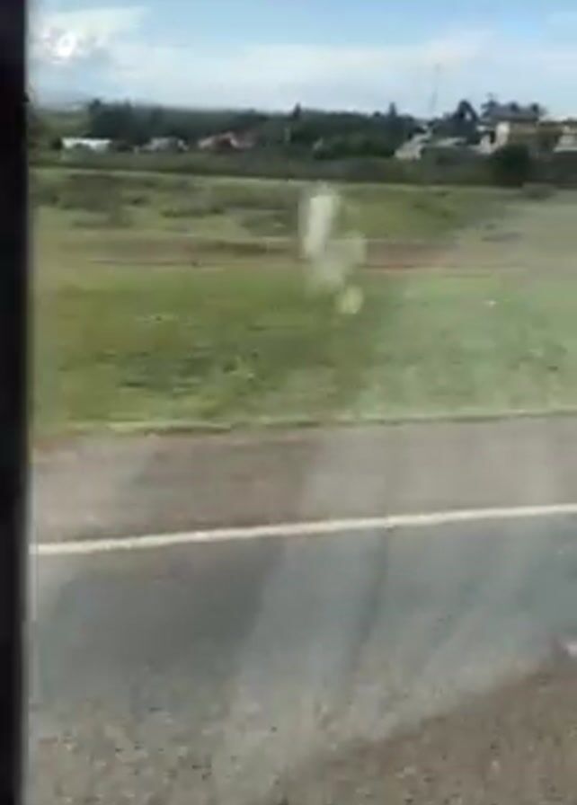view from a moving vehicle, likely a bus, traveling on a paved road