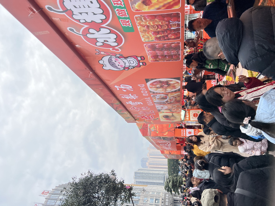 A bustling crowd gathers beneath a large, orange vendor stall adorned with images of candied fruit skewers and various delicacies. The stall's signage features cartoon characters and Chinese writing, promoting fresh and readily available treats. A dense cityscape forms the backdrop, juxtaposed with bare trees and a cloudy sky. People are bundled in winter clothing, suggesting a chilly atmosphere.