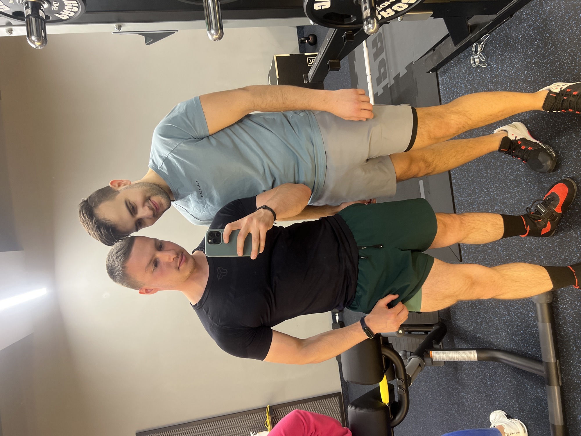 An indoor gym in Burgas, Bulgaria, features two adult males posing for a photograph