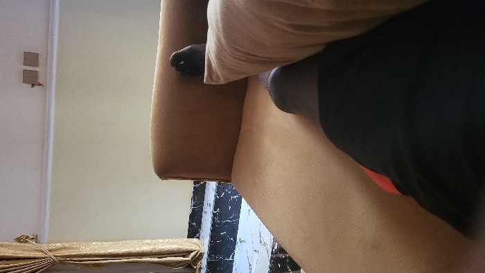 The image depicts a first-person view of a person resting on a brown upholstered chaise lounge in an indoor setting within Babawa, Nigeria. The individual, with dark skin, is wearing black shorts with a visible red stripe on the right side. Their left leg is bent at the knee, with the left foot resting against the back of the chaise. A light brown pillow lies across the lower body, partially obscuring the right leg. To the left, golden-colored curtains with a decorative tie-back are visible alongside a black and white marbled staircase. The background consists of a light beige wall. Near the ceiling on the right, two small, square, light-colored panels are affixed, one with a red wire or string extending downwards.
