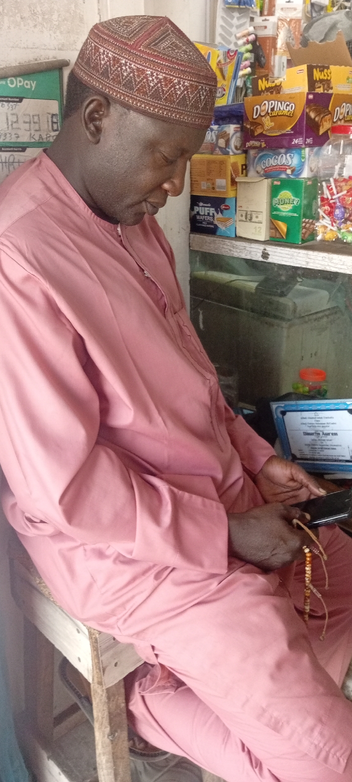 An adult male is seated indoors within a retail establishment in Dorayi, Nigeria