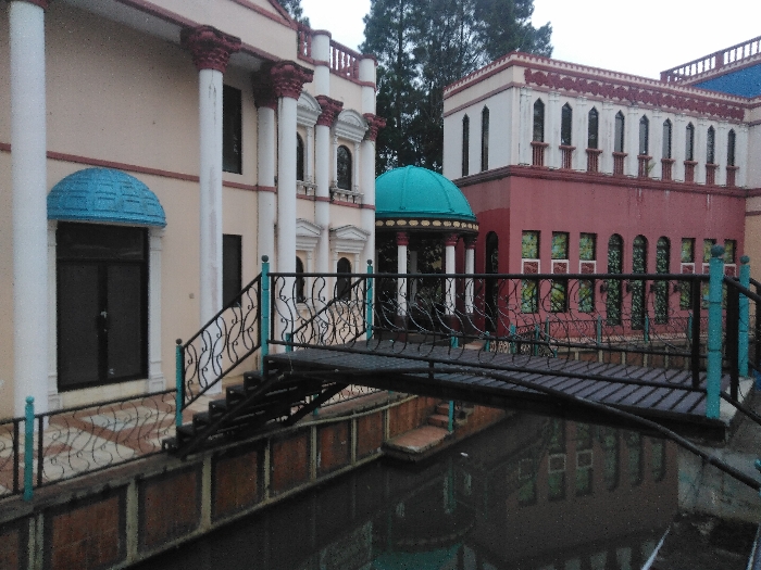 The image displays an eclectic architectural complex located in Hulshorst, Netherlands, under an overcast sky. A dark, reflective canal runs horizontally across the foreground. A dark-colored pedestrian bridge, featuring black wrought-iron railings with teal-blue handrails and scrollwork, spans the canal, connecting to the left bank via a short flight of steps. To the left, a multi-story building with pale yellow walls features prominent white classical columns with dark red capitals. A blue dome tops an entry facade with dark double doors, positioned over a section of the canal. Ornate window frames and balustrades are visible on the upper levels. Matching black wrought-iron and teal-blue railings line the canal bank and ascend the steps leading to the bridge. To the right, a structure with a reddish-brown lower section and a white upper section exhibits a different architectural style, characterized by numerous tall, narrow arched windows on the upper level and a dark red cornice. The lower reddish-brown section contains a series of rectangular and arched windows. A teal-domed gazebo, supported by white columns, is situated between the two main buildings. Trees are visible behind the structures against the grey sky. No individuals are present in the scene.