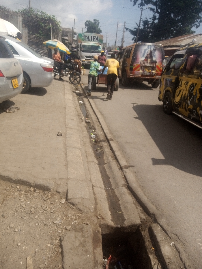 A bustling street scene shows a road with parked cars on the left. A roadside drain runs along the edge of the road. Two men pull a cart, walking towards a white truck with "TAIFA" printed on it. Vehicles including buses and motorcycles are visible further down the street. People are also seen on the street and sidewalk. The image captures the lively atmosphere of a busy urban area.