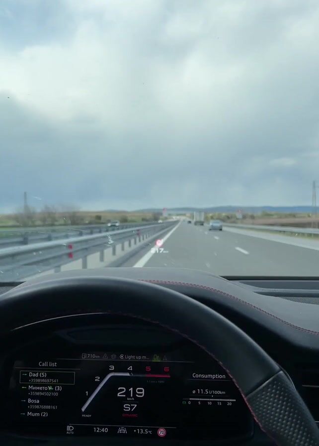 The camera is mounted behind the steering wheel of a car, looking out through the windshield at a multilane highway. The car is moving at high speed, indicated by the dashboard display fluctuating between 217 and 223 kilometers per hour. The dashboard also shows the time as 12:40, an outside temperature of 13.5 degrees Celsius, and fuel consumption of 11.6 liters per 100 kilometers. A head-up display projects speed onto the windshield. Ahead, the highway stretches into the distance under a cloudy sky, with several other vehicles including a large white truck in the right lane. Guardrails line both sides of the road. The car's dashboard also displays a call list with names such as "Dad," "Mimet," "Bosa," and "Mum."