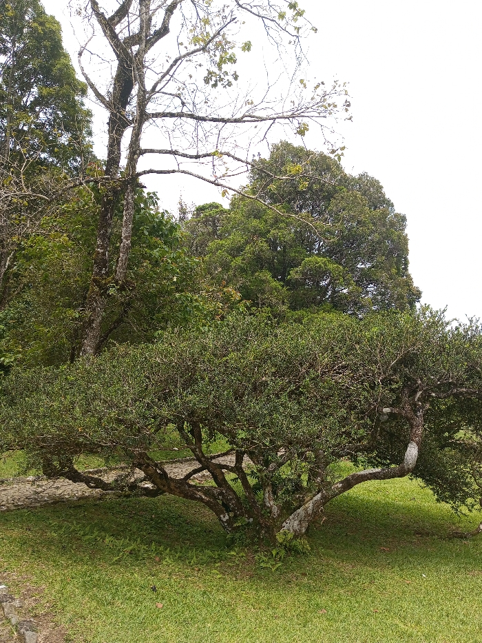 The image depicts a natural outdoor scene in New Serchhip, India, characterized by lush vegetation under an overcast white sky. In the foreground, a vibrant green lawn covers the lower portion of the frame. A partially visible, light-colored stone path curves into the scene from the left, bordered by grass. Dominating the midground is a broad, low-growing tree featuring multiple gnarled, moss-covered trunks and dense green foliage. A section of one trunk on the right exhibits white paint. Behind this tree, a dense background of mixed forest is visible, composed of various trees with full green canopies, along with some taller, slender trees featuring sparse leaves and bare branches extending towards the top of the frame. No individuals, actions, or specific interactions are present in the scene.