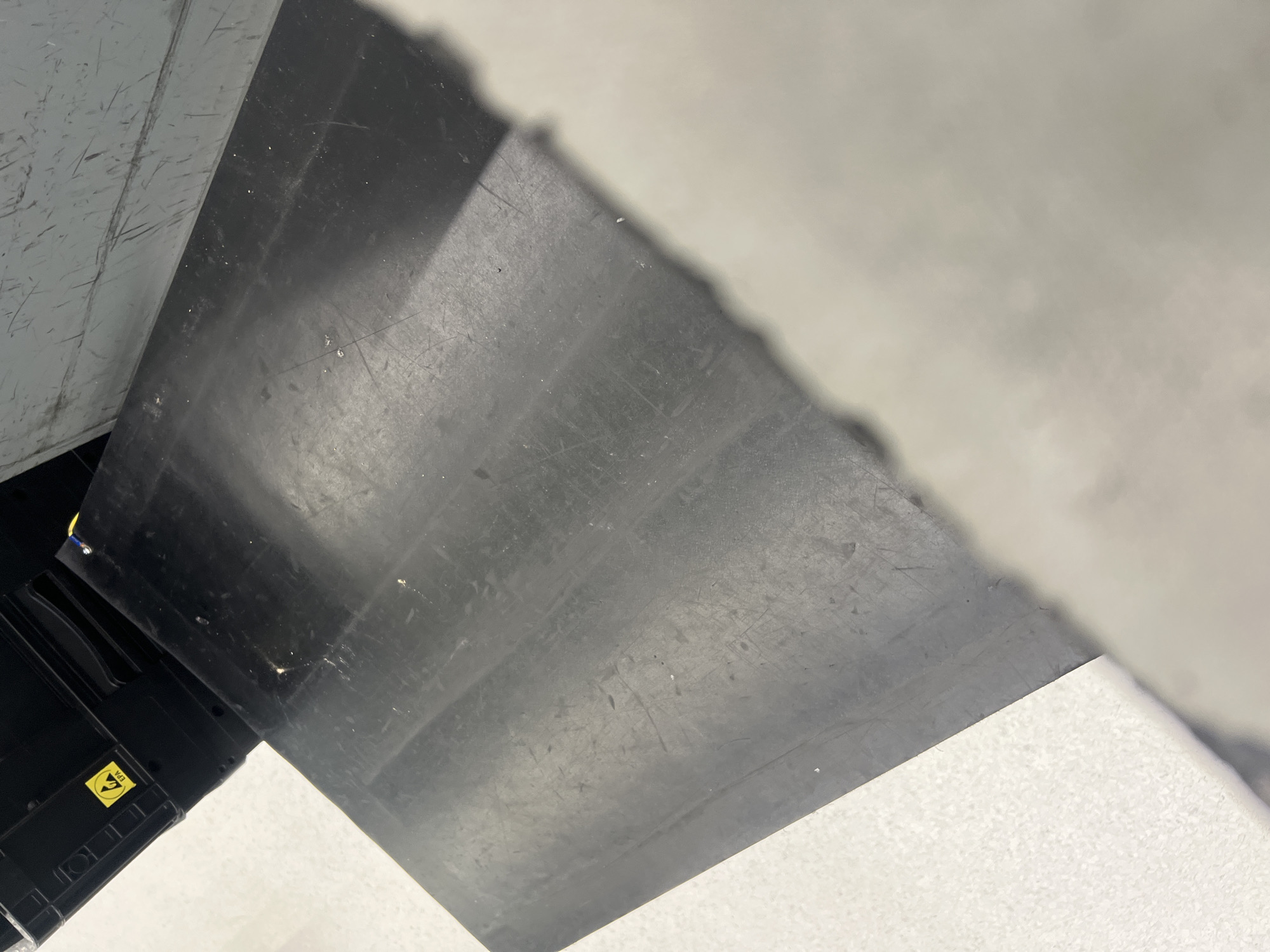 close-up, angular view of flooring surfaces in an industrial or commercial setting. The flooring consists of panels or tiles in at least three distinct colors or materials: light gray, dark gray or black, and white. The surfaces show signs of wear and tear, including scratches and scuff marks. In the bottom left corner, part of an electronic device is visible, with a yellow warning label. There is no indication of the image being taken in Bozhurishte, Bulgaria.
