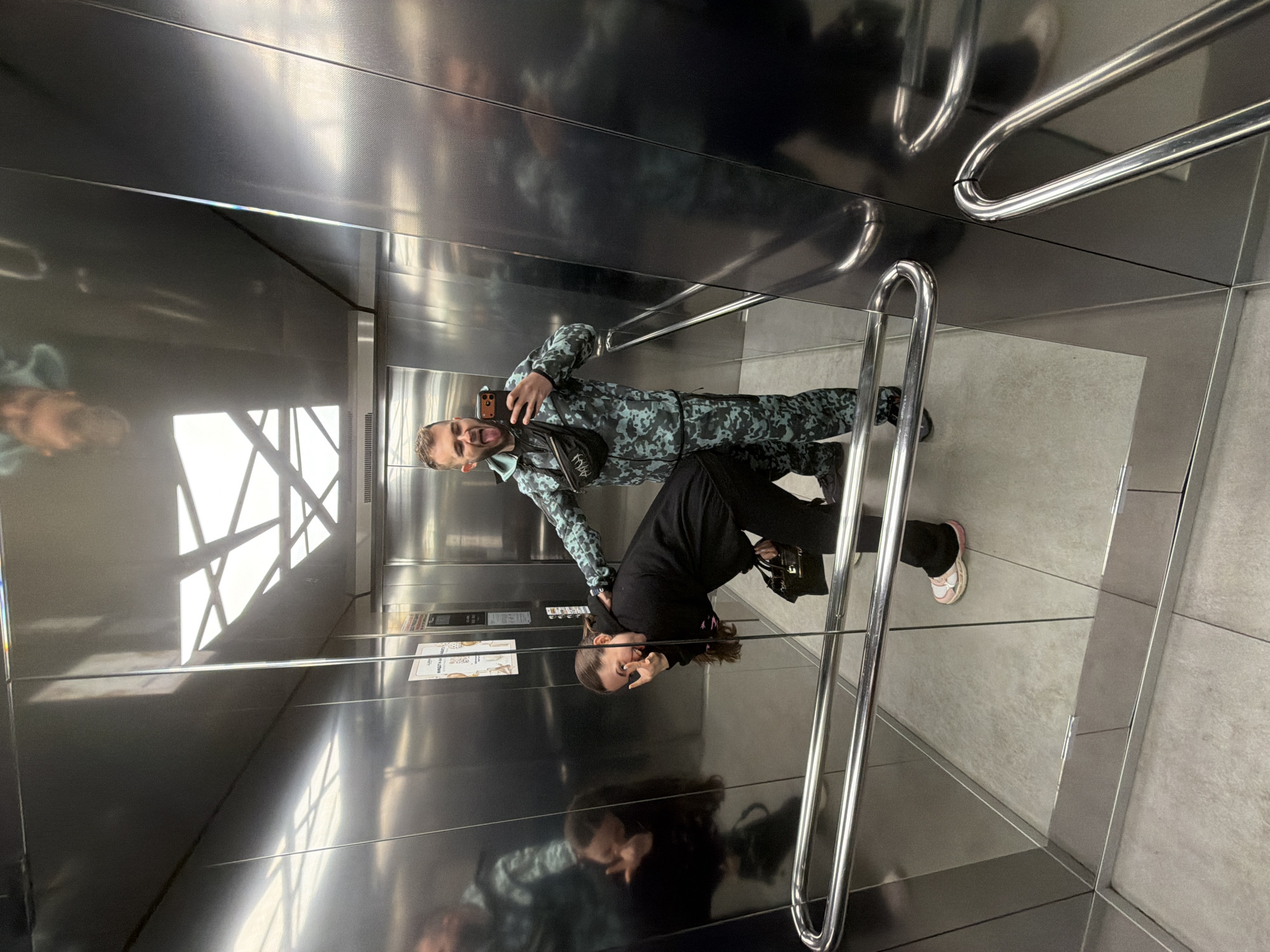 The image captures two individuals, seemingly a couple, taking a selfie in an elevator. The man, positioned to the left, wears a camouflage patterned jumpsuit and a black shoulder bag. He holds a mobile phone, presumably to take the picture, and is sticking out his tongue. The woman, on the right, wears a black hoodie and pants and carries a black handbag. She is making a hand gesture. The elevator has stainless steel walls with handrails. Based on the presence of Cyrillic script on informational signage in the elevator, the location is likely Pernik, Bulgaria. The elevator reflects light patterns from the ceiling.
