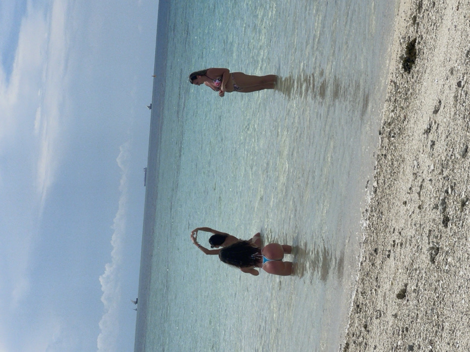 The scene depicts a shallow coastal water area in Zanzibar, Tanzania. Three adult females are present in the ocean's clear, light turquoise water near a light-colored pebbled shoreline. From left to right: 1. A female, viewed from behind, is positioned with her body bent forward at the waist. She wears a light blue thong bikini bottom and a dark bikini top. Water covers her legs up to mid-calf. 2. A second female, located centrally and slightly further back, is also viewed from behind. She wears a dark bikini and has her arms raised above her head, with her hands clasped to form a heart shape. Her lower body is submerged from the waist down. 3. A third female stands upright on the right side of the frame, viewed from her left profile. She wears a multi-colored floral bikini. Water reaches her knees. The immediate foreground displays a beach composed of small, light-colored pebbles and shell fragments. The ocean extends to the horizon under a partly cloudy sky. Distant marine traffic is visible: a sailboat is located on the far left, and a large cargo vessel is positioned towards the right, with an additional smaller vessel or buoy further right.