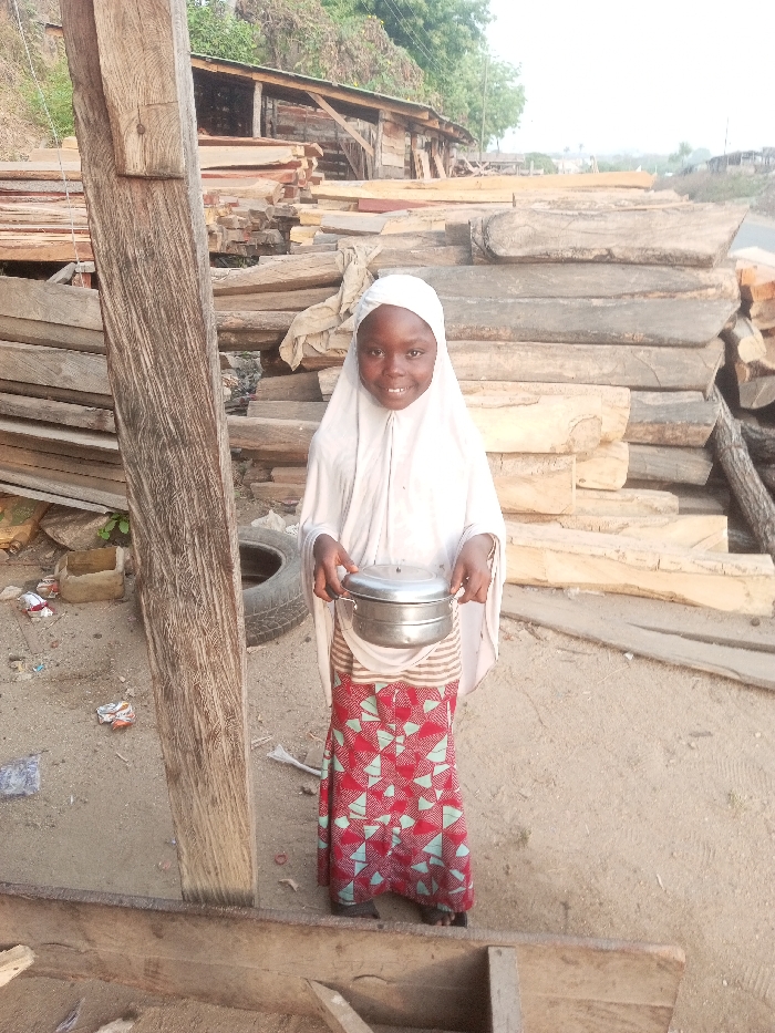 A young girl, likely of Muslim faith, stands smiling in a cluttered outdoor area. She wears a white hijab and a vibrant red and blue patterned skirt. She holds a metal container with handles. Behind her, stacks of lumber are visible, and a weathered wooden structure is in the background. The scene seems to be a working area, possibly a sawmill, with a mix of wood, dirt, and discarded items scattered around.