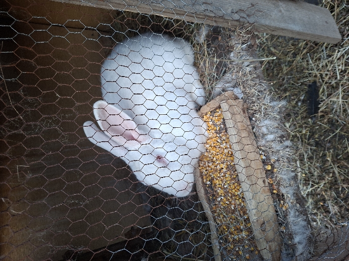 - "The image displays a white domestic rabbit resting inside a wire mesh enclosure in Moshtanets, Bulgaria" by FM-iKbEw2, licensed under CC BY 4.0