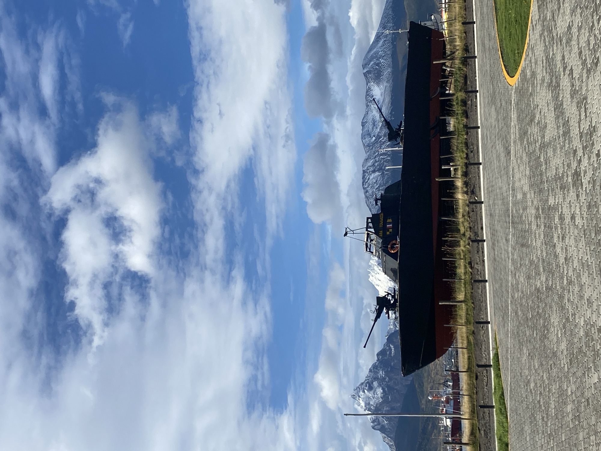An outdoor, wide-angle image depicts a dry-docked naval vessel, identified as an Argentine Navy (ARA) patrol boat, against a backdrop of snow-capped mountains and a partially cloudy blue sky in Ushuaia, Argentina. The central subject is a dark-hulled boat, approximately 30-40 meters in length, painted black above the waterline and red below, supported on wooden pilings. It features two prominent dark-colored automatic weapons, one positioned on the bow pointing forward and another on the stern pointing aft. A small central superstructure includes a mast, communication equipment, and a visible lifebuoy on its starboard side. Partial text "ARA TOU" and several national flags, including the Argentine flag, are visible on the superstructure. The vessel is situated on a strip of unpaved ground with sparse dry vegetation and a low fence line consisting of wooden posts and wire. In the immediate foreground, a grey interlocking paver surface, likely a pedestrian plaza or walkway, curves to the right, bordered by a strip of green grass with a yellow curb. A series of short, black cylindrical bollards delineate the paved area from the unpaved strip beneath the vessel. The midground features a body of water, likely a harbor, with several other vessels including a red-hulled ship, visible in the distance to the left of the main boat. The background is dominated by a range of rugged, snow-covered mountains, prominent on the left and extending across the horizon. The sky is bright blue with scattered white cumulus clouds of varying sizes and densities. No people are visible in the scene.