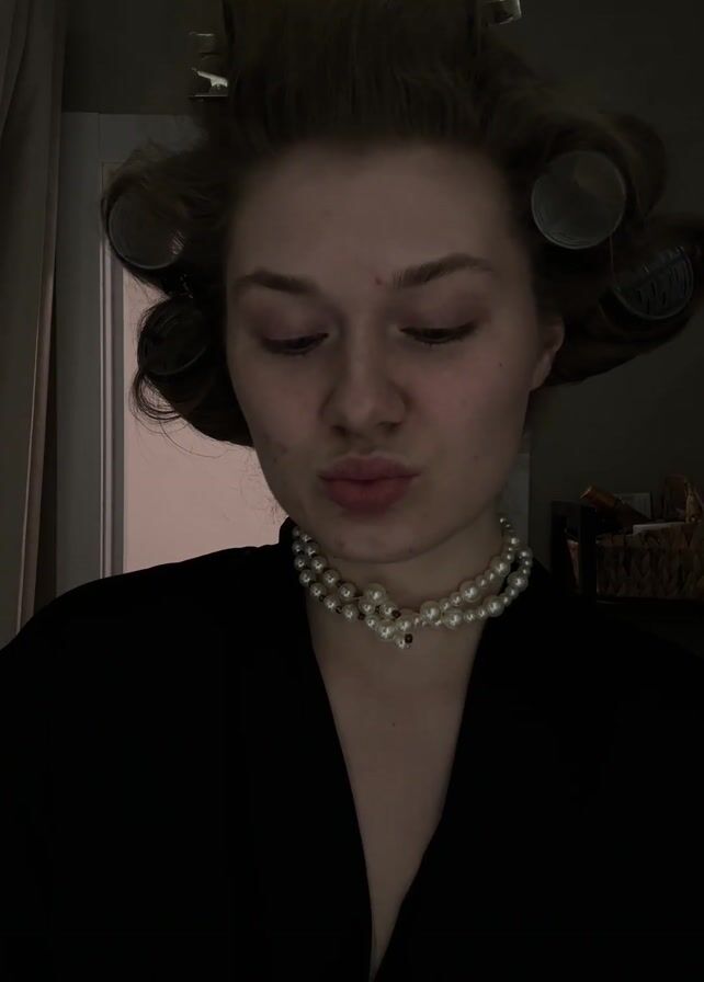 young woman with fair skin and auburn hair in curlers, wearing a double-strand pearl necklace and a black robe. She looks down and then up at the camera, puckering her lips slightly. She then places a tan adhesive bandage on her face near the corner of her mouth, pointing to it with one finger. The lighting is dim and indirect. A doorway and a curtain are visible in the background.