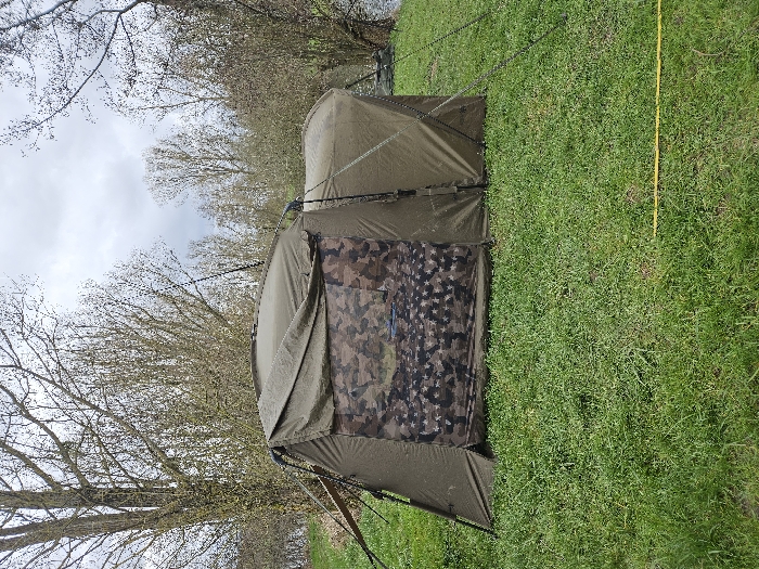 This image depicts a large, olive-green fishing bivvy, likely in Gavisse, France, situated on a grassy bank beside a body of water