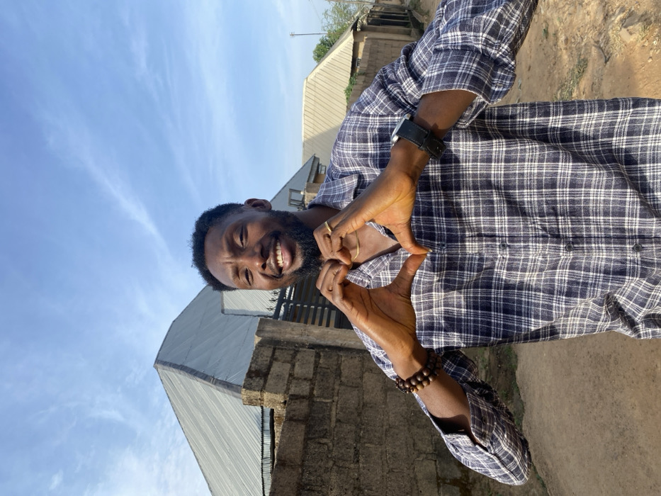 A man smiles brightly while making a heart shape with his hands. He has a dark beard and wears a button-down plaid shirt, a watch on his left wrist, and a beaded bracelet on his right. He has a gold ring on his left pinky. Behind him is a low building with a metal roof and a partial view of a blue sky with wispy clouds. The image is slightly tilted.