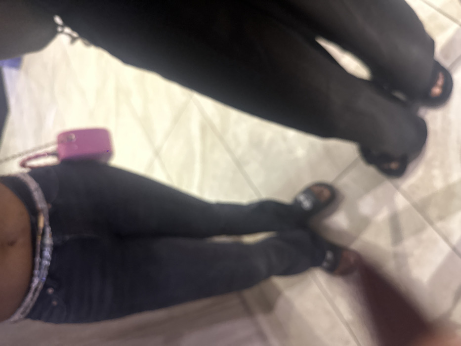The scene depicts the lower bodies of two individuals standing on a light-colored tiled floor in Itirin, Nigeria. **Person 1 (left):** A person with exposed midriff wears dark blue jeans, secured by a shimmering, possibly beaded or sequined, low-slung belt. A small, bright pink handbag with a chain strap hangs from their right side. Their feet are clad in dark slides or sandals with a light-colored detail, exposing their toes. A dark red shadow, possibly from an unseen object or a finger, intrudes into the lower-left foreground. **Person 2 (right):** Positioned to the right and partially obscuring Person 1, this individual wears dark-colored lower garments, possibly pants or a dress. They are wearing dark open-toed sandals or heels, with visible painted toenails on the left foot. **Environment:** The flooring consists of light-toned, possibly beige or off-white, square tiles with visible grout lines. A vertical light-colored surface, likely a wall or partition, is partially visible on the far left. The lighting is diffused, casting soft shadows. There are no clear actions or interactions depicted beyond standing.