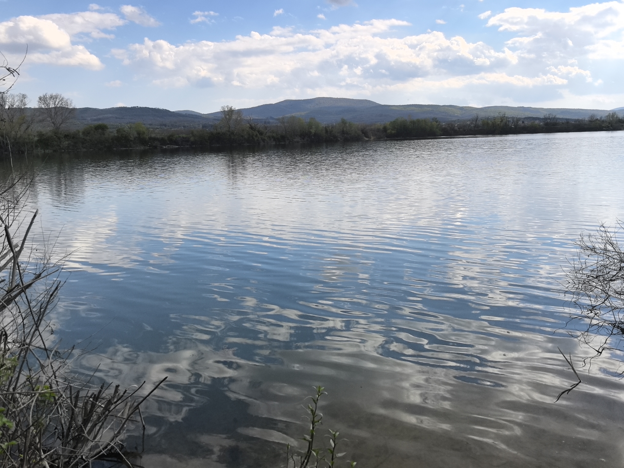 The image captures a serene scene of a body of water, possibly a lake or pond, reflecting the sky above. The water surface is rippled, distorting the reflection of the blue sky and scattered white clouds. In the background, there is a line of trees and vegetation along the shoreline, with a distant hill or mountain range providing a backdrop. The foreground features sparse vegetation along the water's edge, some with bare branches. The location is Dabovo, Bulgaria. No people are visible in the image. The focus is on the natural landscape and the play of light and reflection on the water.