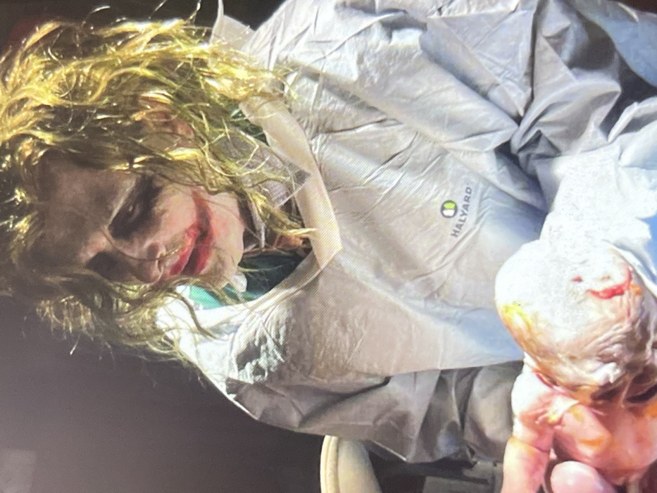 A dimly lit, close-up image depicts an individual in an indoor setting within Zaria, Nigeria. The person's face is heavily made up with white foundation, dark smudges around the eyes, and a wide red smile extending laterally, characteristic of a "Joker" aesthetic. Disheveled, wavy, light-colored hair, potentially dyed, frames the face. The individual wears a grey, possibly disposable, protective gown featuring the "HALYARD" logo on the right chest area, with a green garment visible beneath. Both hands of the individual are present at the bottom center of the frame, holding a pale, dismembered human head or a highly realistic prop. This object shows yellowish and reddish discolorations, consistent with bodily fluids, particularly on its facial region. The individual's gaze is directed downwards towards the object. A light-colored, indistinct object, possibly a piece of furniture, is partially visible in the blurred background on the left.