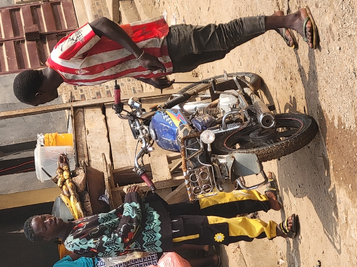 The scene depicts an unpaved outdoor area, likely a commercial street or market in an unidentified city. The ground is dry, reddish-brown dirt. In the background, a basic building with brown wooden doors or shutters and exposed reddish-brown brickwork is visible behind a makeshift wooden stall. Two adult males are present. The male on the left has dark skin, short dark hair, and wears a black long-sleeved sweater with a complex teal, red, and white pattern. He also wears black cargo pants featuring prominent yellow lower leg panels, one adorned with a yellow smiling face emblem. His footwear consists of black and yellow striped slide sandals. He stands facing slightly right, with his mouth open, and holds a light-colored object in his right hand. The male on the right has dark skin and short dark hair. He wears a red and white vertically striped short-sleeved t-shirt with a dark logo on the right chest, and dark-colored pants cropped above the ankles. He wears greenish-yellow flip-flops. He stands facing slightly left, observing the man on the left. A blue motorcycle with yellow, white, and black decals on its fuel tank is parked centrally on the dirt ground between the two men. It has chrome engine components and an exhaust pipe, with red handlebar grips. A metal cargo rack is affixed to the rear fender, containing four silver, circular objects and a wooden plank. The wooden stall in the background displays several items, including a clear plastic container with a white lid, a yellow bucket, and a dark bowl holding several roasted items, possibly plantains or yams, on a metal skewer. The scene is brightly illuminated by direct sunlight, casting clear shadows on the ground.