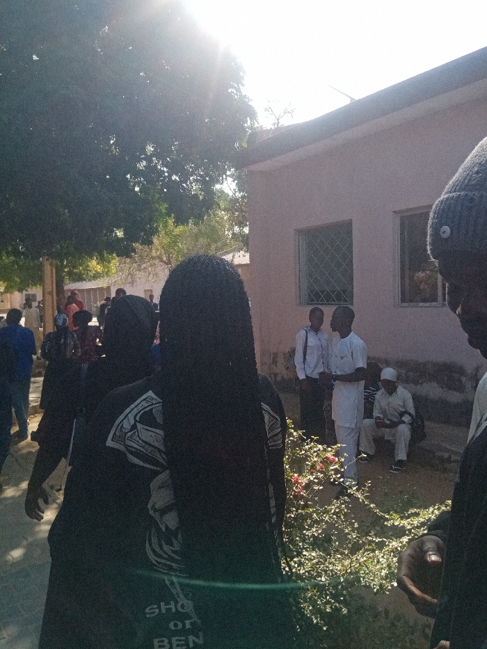 A group of people gathers outside a pinkish building. Two individuals in white attire stand, while another in white sits on the ground. A person wearing a black shirt with a Superman logo is in the foreground, with their back to the camera. A tree is partially visible on the left. The sun is bright, creating a glare in the image.